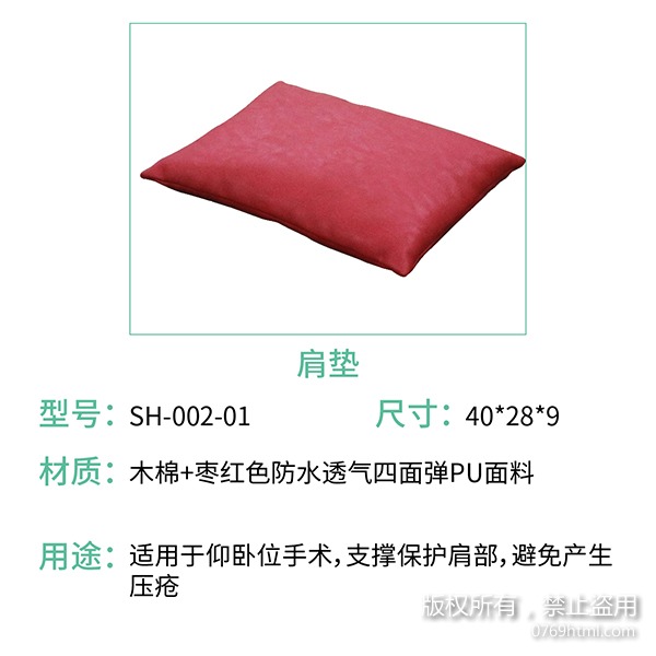 蒙泰海綿體位墊之肩墊是用來支撐保護肩部,避免壓瘡的產生,一般用于仰臥位手術,選用棗紅色四面彈防水面料,與皮膚接觸有良好的依從性,內里填充木棉,軟硬舒適,根據不同使用用途有多個尺寸。