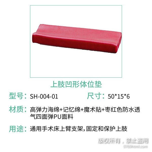 蒙泰護(hù)理凹形體位墊有上肢用凹形體位墊們也有下肢用凹形體位墊,選用棗紅色四面彈面料,防水透氣,海綿選用高彈力海綿和記憶棉組合拼接,既能做到支撐也能達(dá)到減壓效果。上肢凹形體位墊通用于手術(shù)床上臂支架,固定和保護(hù)上肢。下肢凹形體位墊俯臥位時(shí)支撐保護(hù)膝關(guān)節(jié)。