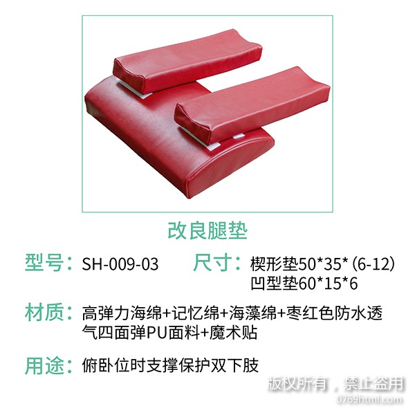 這款改良腿墊材質由:高彈力海綿+記憶綿+海藻綿+棗紅色防水透氣四面彈PU面料+魔術貼;規格有:楔形墊50*35*(6-12)、凹型墊60*15*6、楔形墊50*28*(4-8)、凹型墊50*15*6;改良腿墊主要用途:俯臥位時支撐保護雙下肢